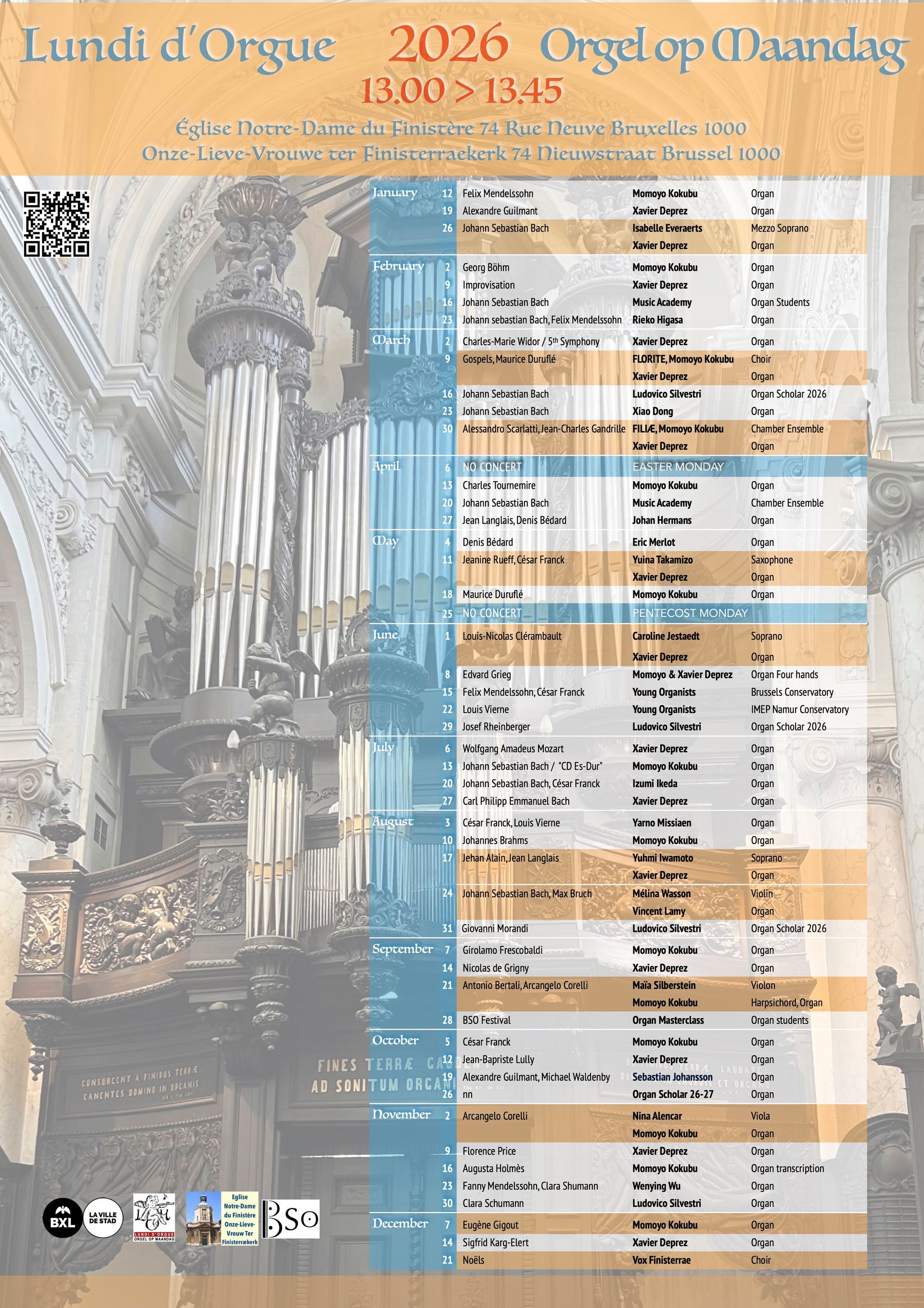 Every Monday at 1 o'clock p.m. to 1:45, throughout the year with the exception of Easter Monday and Pentecost Monday, the church's organists Momoyo Kokubu and Xavier Deprez, an invited organist, or our organ scholar will play an organ recital or a chamber music concert (with choir or soloist).